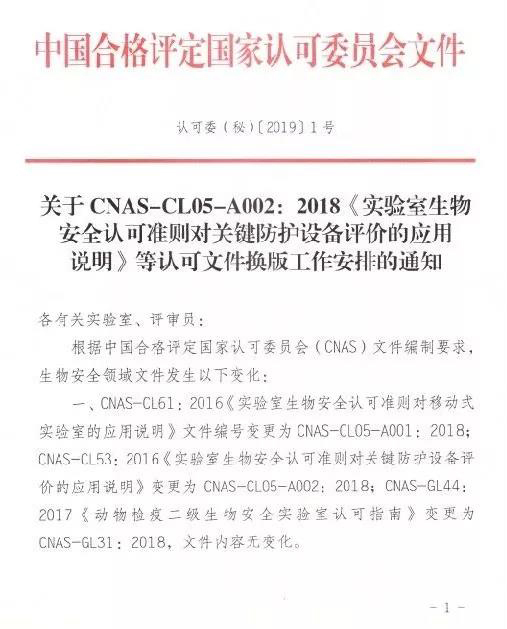 1月8日,中国合格评定国家认可委员会(CNAS)发布了CNAS-CL05-A002:2018《实验室生物安全认可准则对关键防护设备评价的应用说明》等认可文件换版工作安排的通知。2019年7月1日前,新旧版本文件均可使用;7月1日及以后,实验室提交的认可申请及所有评审活动均需使用新版文件。