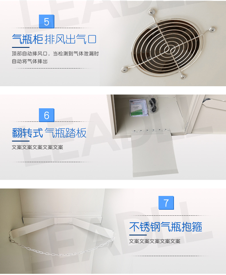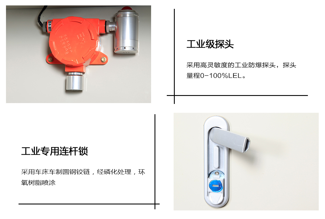 特征:配置气体自动检测报警装置.当被检测气体发生泄露,浓度达到预设定值时,装置自动报警.可选配联动通风系统将柜内气体排出户外.