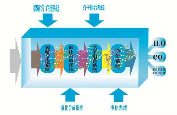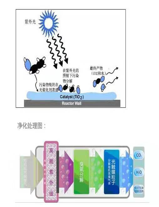 光氧催化废气处理装置采用紫外线光源对废气分子链进行净化的专业技术,运用253.7纳米波段光切割、断链、燃烧、裂解废气分子链,改变分子结构,为一重处理;取185纳米波段光对废气分子进行催化氧化,使破坏后的分子或中子、原子以O3进行结合,使有机或无机高分子恶臭化合物分子链,在催化氧化过程中,转变成低分子化合物CO2、H2O等,为第二重处理;再根据不同的废气成分配置7种以上相对应的惰性催化剂,催化剂采用蜂窝状金属网孔作为载体,全部与光源接触,惰性催化剂在338纳米光源以下发生催化反应,放大10-30倍光源效果,使其与废气进行充分反应,缩短废气与光源接触时间,从而提高废气净化效率,催化剂还具有类似于植物光合作用,对废气进行净化效果,为第三重处理,通过三重处理后的废气其除臭可达99%以上,净化、脱臭效果大大超过1993年颁布的恶臭污染物排放标准(GB14554-93)。