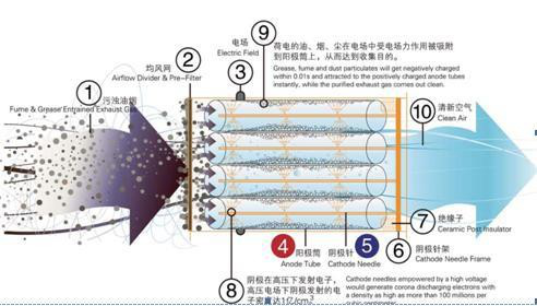 技术处理原理/Principle Of Technical Treatment在外加电场的作用下,介质放电产生的大量高能电子轰击污染物分子,使其电离、解离和激发,然后便引发了一系列复杂的物理、化学反应,使复杂大分子污染物转变为简单小分子安全物质,或使有毒有害物质转变为无毒无害或低毒低害物质,从而使污染物得以降解去除。因其电离后产生的电子平均能量在1eV-10eV,适当控制反应条件可以实现一般情况下难以实现或速度很慢的化学反应变得十分快速。电场的设计使废气粒子的运动速度较低,一般在零点几秒内便能使废气粒子荷上足够的电荷,带电粒子在电场中会受到电场力(库仓力)的作用,其结果是油烟粒子被吸附到阳极上,因此净化率非常高,而且特别适用于捕捉粒径较小和重量较轻的废气粒子。