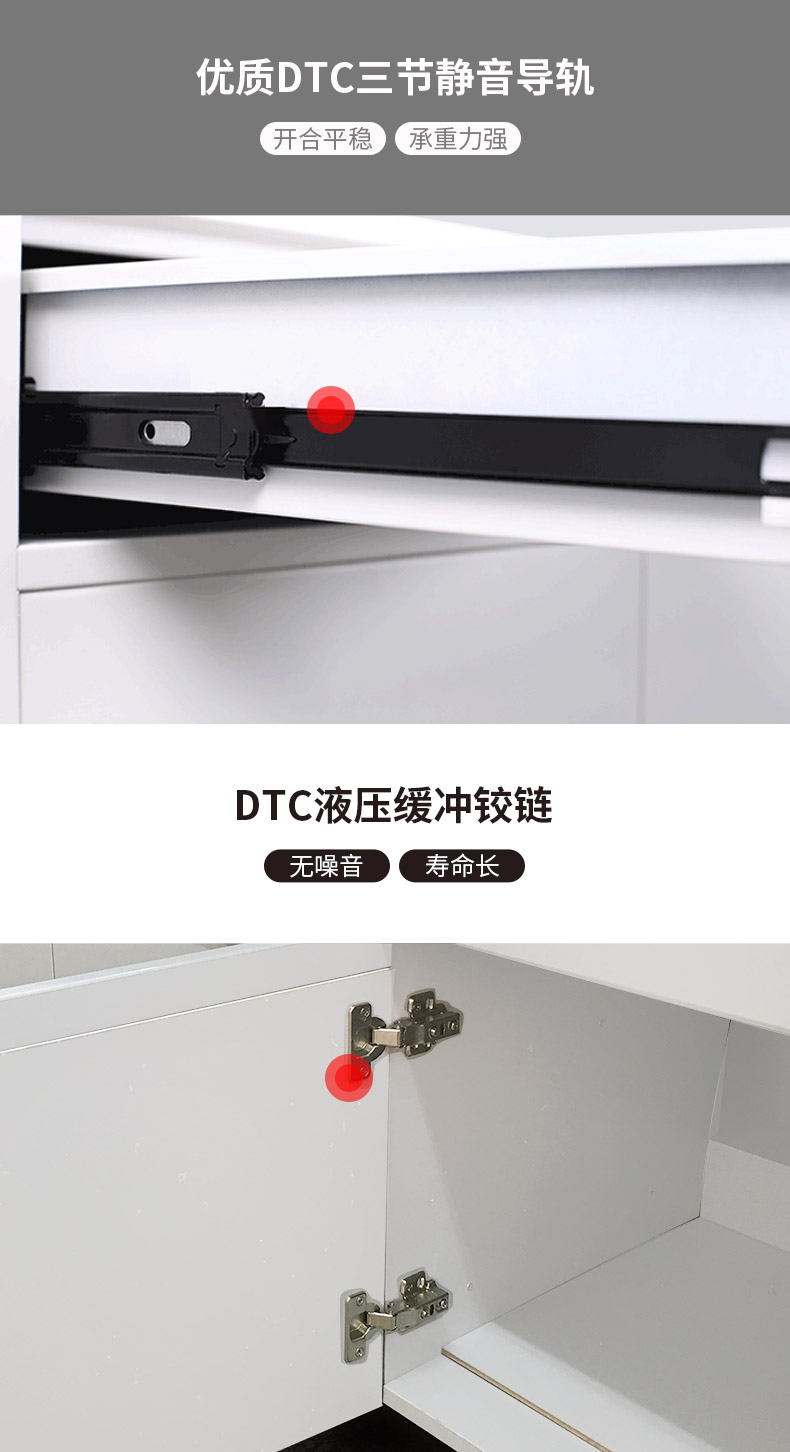 16.合页:采用SEFA8标准厂制不锈钢合页或东泰DTC液压缓冲铰链,有好的不锈耐腐蚀性能,保障了开门的灵活度、顺畅度。