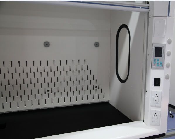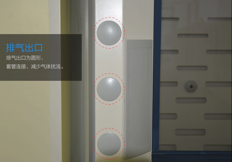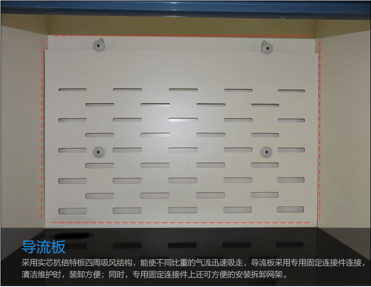 采用实验室专用5mm厚抗倍特板, 具有较强的抗酸碱、耐腐蚀性,装置于工作空间后方以及上方处,由至少三块抗贝特板组成,使得工作空间与排气管路的连接处之间形成一个气室,将污染气体均与地排出。导流板使用导流夹将其与柜体结合,可重复拆装。