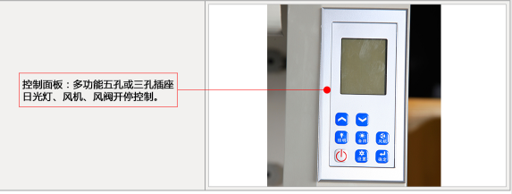 11.控制面板: 采用液晶控制面板,设置有电源、开关、照明、风机以及运转指示灯等按钮,液晶显示屏能清晰地显示通风柜的运行情况.